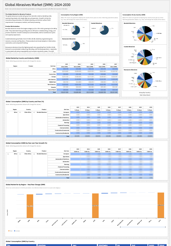 It provides market intelligence for abrasive products (coated, nonwoven, and bonded abrasives) through detailed data sets covering total consumption value by the following parameters: year, region, products, and end-user industries matching those presented in our published market intelligence report. It also offers an overview of the competitive landscape and key qualitative market insights.